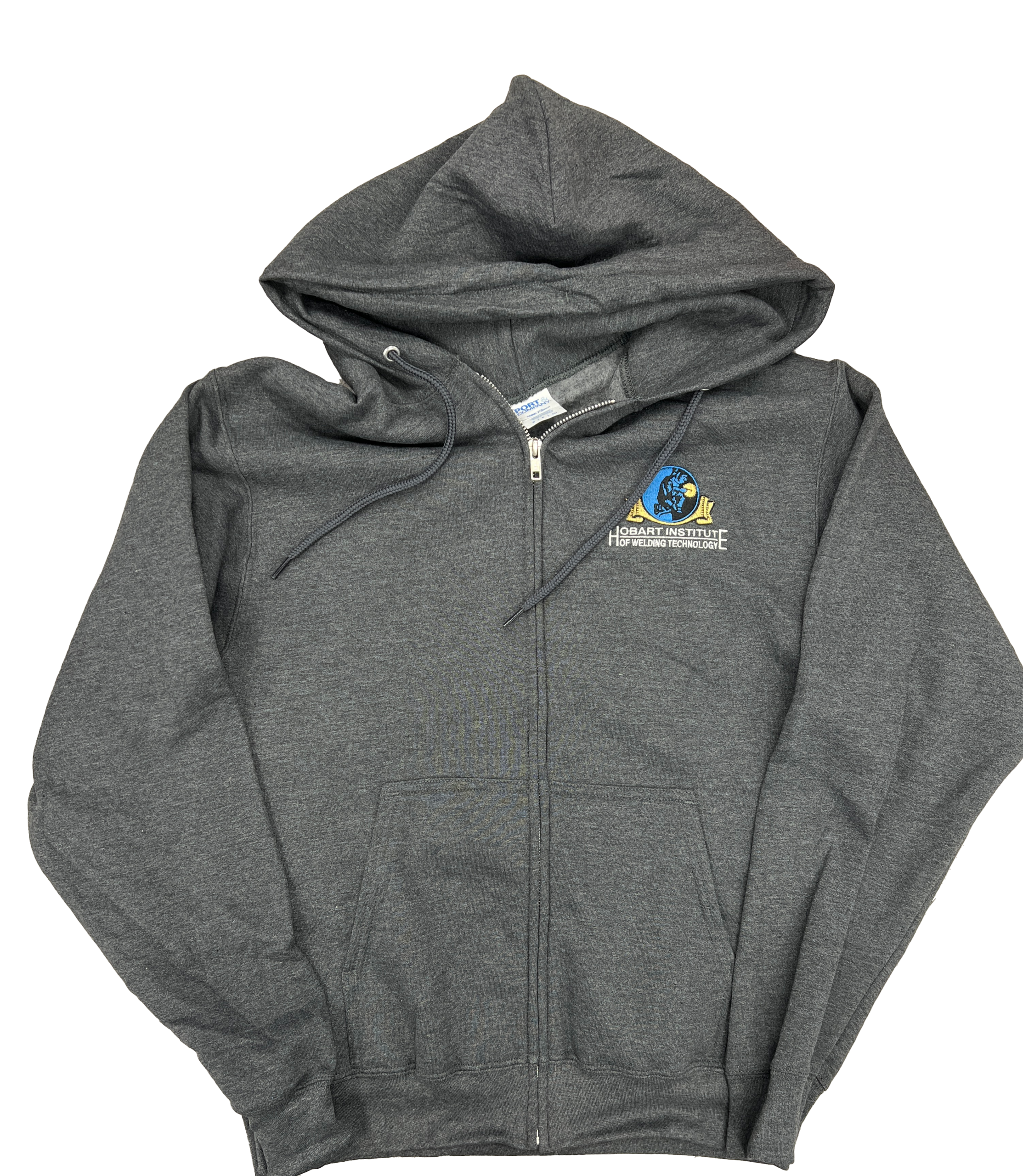 Dark Grey Zip Up Hoodie with 3 color Hobart Institute logo